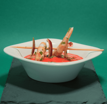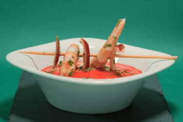 Salmorejo cordobés con esferas de melón y crujiente de jamón