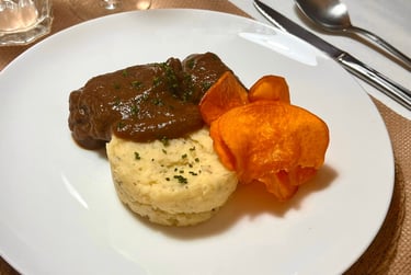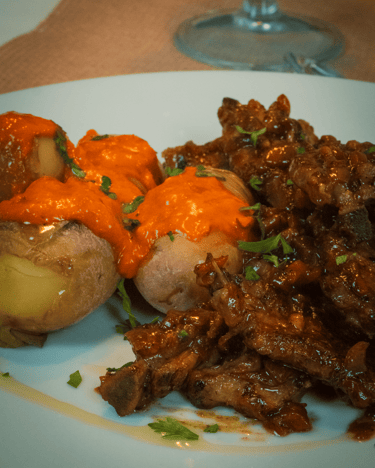 Carrilleras al vino tinto con parmetier trufado y chips de boniato