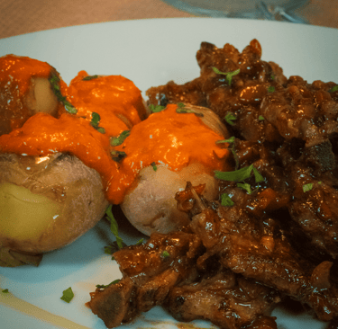 Caldereta de cordero al ras al hanut y patatas arrugadas con mojo