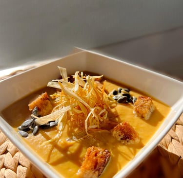 Crema de calabaza con curry y puerro frito Calidez, viaje y equilibrio en un solo gesto
